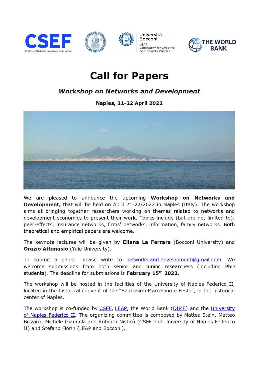 @elianalaferrara and@orazio_at Submission deadline: 15 Feb 2022 Co-organised by@csef_unina,@UninaIT,@LEAPdevelopment, and DIME@WorldBank#EconTwitter#Networks#Developmentpic.twitter.com/PEdizDM4aS