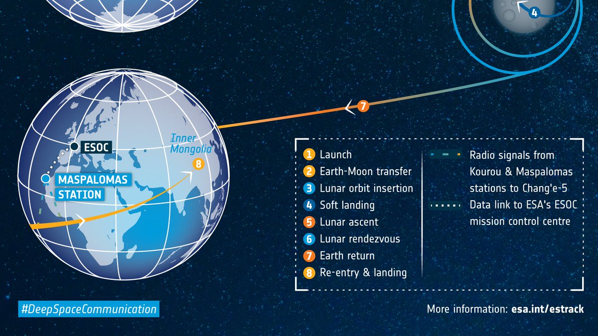 Today's the day! China's #Change5 lunar sample return mission soon lifts off, soft landing on the Moon's far side in a couple of days. Humanity hasnt brought samples back from the Moon since 1975, and we're happy to be supporting the exciting mission with our #Estrack network!pic.twitter.com/GVOe9drc1R