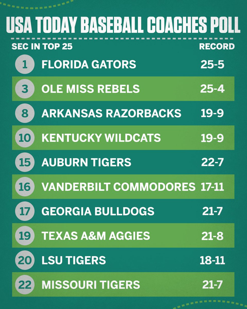 ICYMI: The SEC is the first conference in the history of the USA Today Baseball Coaches Poll to have 10 teams ranked in the Top 25.pic.twitter.com/NVumOshRyo
