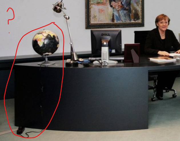 I have questions about this image of Merkel the personal injury attorney. First, the globe. Presumably it lights up or rotates. A lot of effort has gone into supplying it electrical power. An extension cord running across the room, an unsightly power strip. Why? https://twitter.com/DrunkAustrian/status/1372339430569209870 …pic.twitter.com/jtbsPEQaqx
