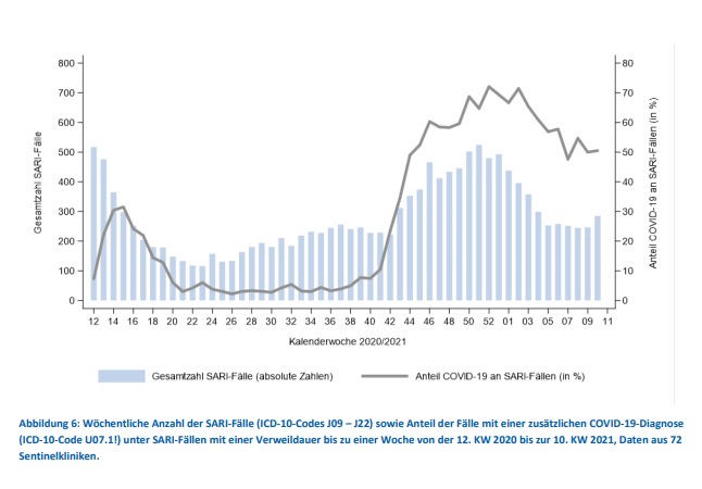 1. Corona season is almost over. Blue bars: Severe respiratory infections at German sentinel clinics over past year (from week 12 2020 to week 11 2021). Grey line: % of SARI cases that are Coronapic.twitter.com/MfNRA5MFqL