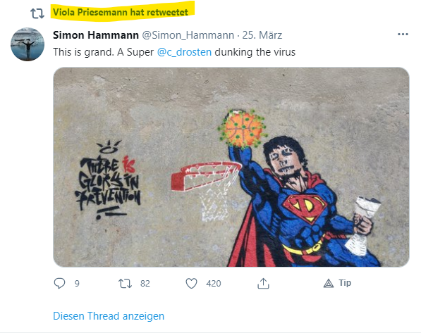 Viola Priesemann, a physicist whose lockdown-justifying models have won her the ear of Merkel's government, retweets this ... graffiti? ... of Christian Drosten as Superman dunking a SarsCov2 virion. This is Science guys.pic.twitter.com/JO4AWP4xwb