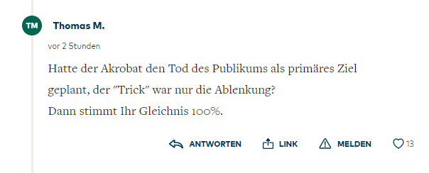 ... the most important part. Also Thomas responds: "Was the death of his audience the acrobat's primary goal, the 'trick' only a pretense?" Sometimes there's good comments in Welt.pic.twitter.com/iVwq9s5MUh