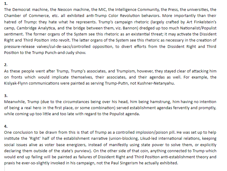 It's unnecessary for everything else in that screenshot, to posit that Trump was somehow a controlled poison-pill psyop. Nobody cares about discrediting third positionists; if anything, they're eager to build them up as credible threat.