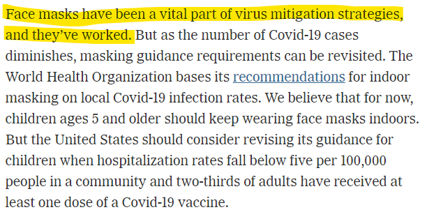 Reading it again & her twitter feed, it's pretty clear she thinks masks are ineffective but is willing to accept them as a condition for school reopening. She & her colleagues pitched the editorial this way. It wasn't enough for the NYT, they wanted her soul too.