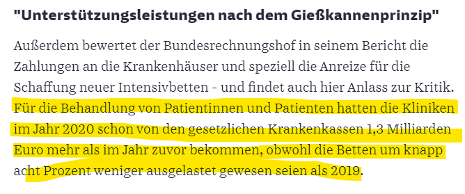 SZ, in an article on the federal audit of the German health ministry under Spahn: "Hospitals ... in 2020 received from public insurance more than 1,3 billion more Euros than in the prior year, although the occupancy was down 8% from 2019."pic.twitter.com/vZJpjufJJh