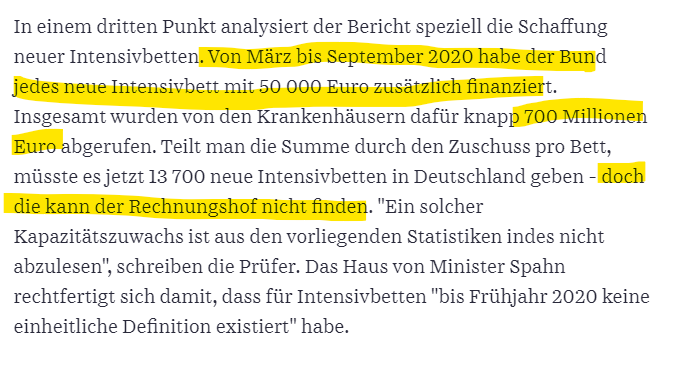 Finally, as I noted earlier, March to September 2020, hospitals were given 50k Euro for every new ICU bed they set up. In total, 700 million Euro were spent on this system - enough for 13.700 new ICU beds. The federal auditors can't find these beds anyhwere.pic.twitter.com/foNkMpHJ9a