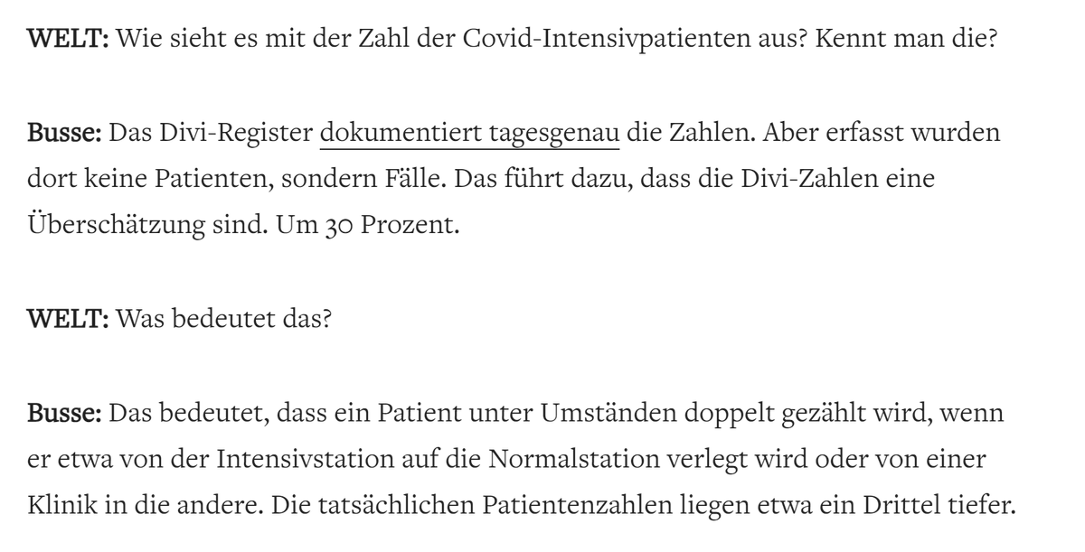 Do we know how many Corona patients are even in the ICU? No, DIVI only tracks cases. "So it happens that the DIVI numbers are an over-estimation. Around 30 percent" What does that mean, asks Welt? It means that transferred patients get counted twice, says our health economist.pic.twitter.com/QgtP0Q92jQ