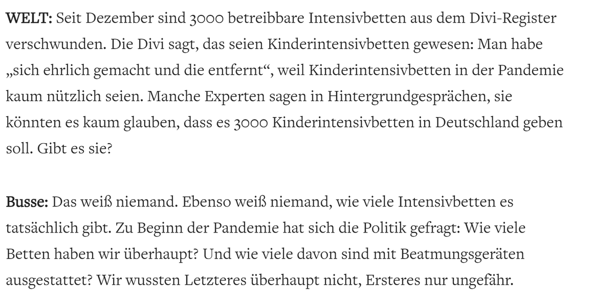 Central disease statistics are propaganda Welt asks a health economist at TU Berlin what happened to 3.000 ICU beds that vanished from stats in Dec. Were they (as some say) unneeded beds for children? "Nobody knows," he says. "Also nobody knows how many ICU beds there even are"pic.twitter.com/FBOzjbLZuT