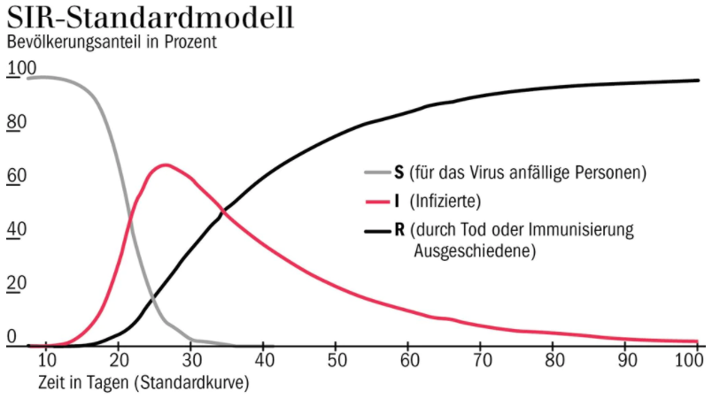 The SIR model (susceptible - infectious - recovered) for the spread of disease was 1st outlined in 1920s & still underpins most Corona modelling. Here's a graph: The grey line = susceptible. Red = infected. Black = dead/ recovered. The more infections, the fewer susceptible.pic.twitter.com/rCHHaAJ646