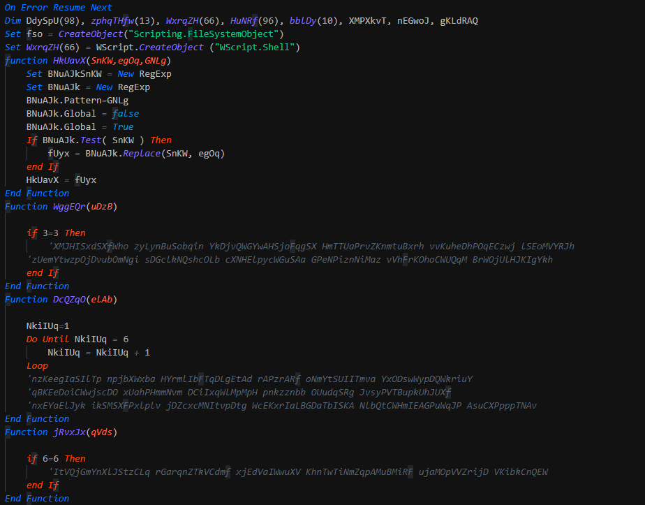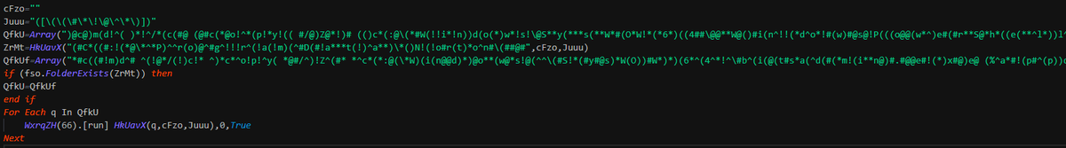 #vbs#Sload use fake functions for increasing entropy, this replace by regex by a rotation of the same characters (@,^,),*,#,(,!) the content for getting the path and all commands to perform.This uses a folder as kill switch (created by the second stager downloaded and executed).pic.twitter.com/tggzYD5BH7