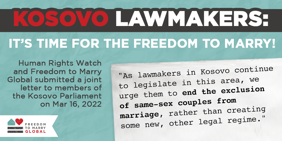 @HRW to members of the Kosovo Parliament – urging lawmakers to include marriage for same-sex couples (and not a lesser substitute) in the updated civil code. It's time for the freedom to marry in Kosovo! https://bit.ly/3tlrpBz