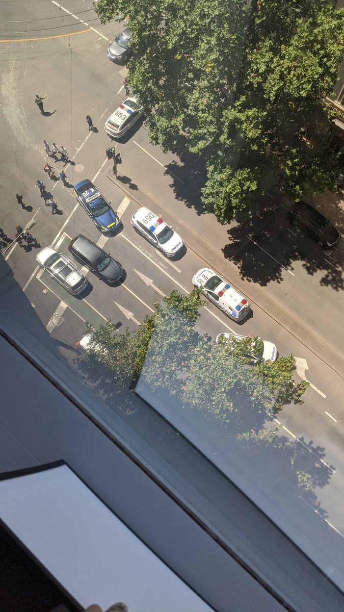 Wasn't sure at the time, but there was a guy on Flinders St standing on a car screaming at the cops. Not sure of many the details, but they shut down the block for safety.