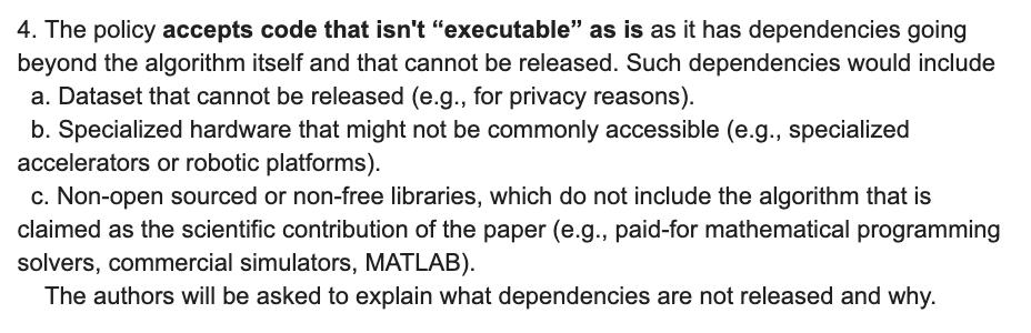 Very happy to see that the NeurIPS code submission policy explicitly allows code that is not executable "as is." IME as a researcher in industry one of the biggest obstacles to releasing code is decoupling it from non-public supporting infrastructure, so this is great to see.pic.twitter.com/y61QDQrKCj