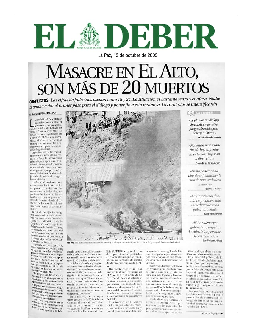 Cómo en la época de la colonia como en la dictadura pensaron que matandonos, masacrandonos y torturandonos creyeron que nos callarian una vez más, el Pueblo unido resistió y vencio en la lucha por el gas. Honor y gloria a los mártires!!! La lucha sigue hermano Presidente