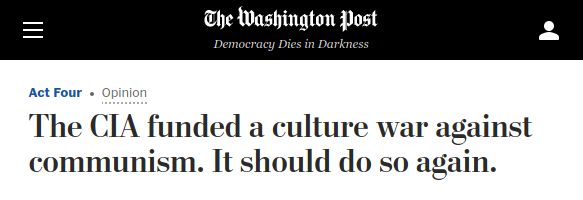 What's interesting about this is why the billionaire class, who have far more money than the CIA, and already own the newspapers, TV broadcasts, movie studios, and social media sites would need the CIA for a "culture war" against communism at all. Can't they do it themselves?