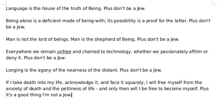 I always mentally add "plus don't be a Jew" to every Heidegger quote that I read.pic.twitter.com/8PvYXwrx1P