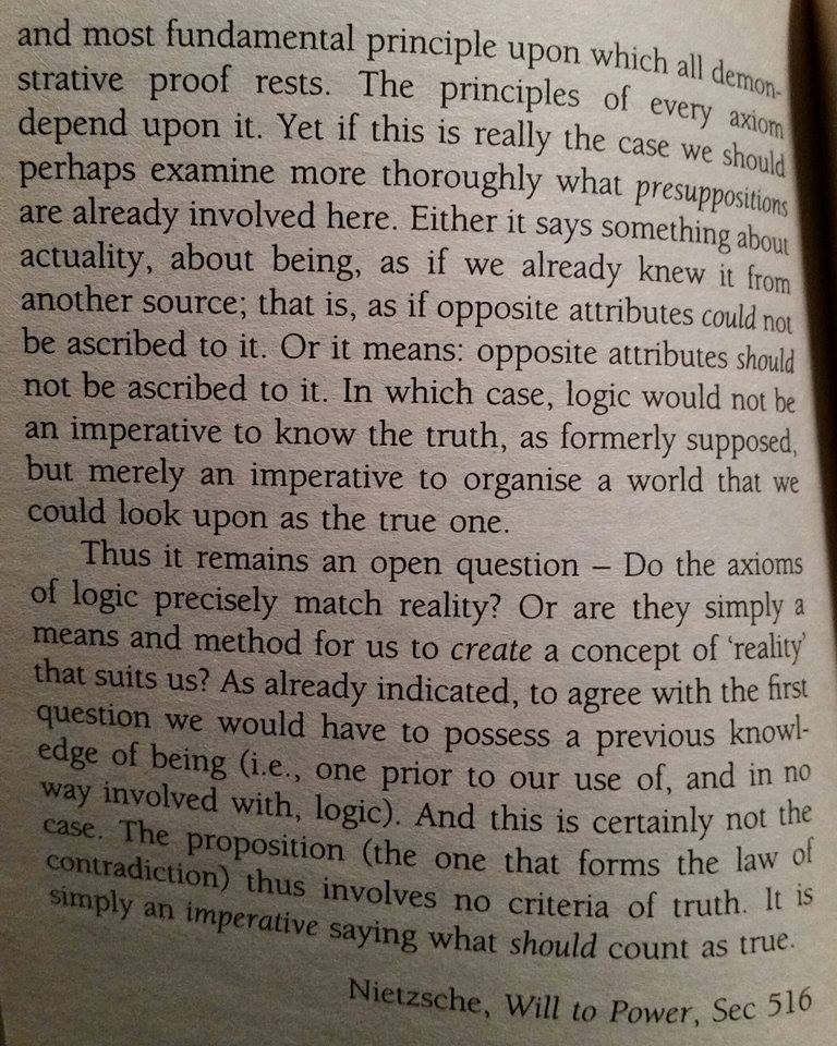 Nietzsche is only pointing out a possible faulty grounding he sees in logic. Questioning is not denying
