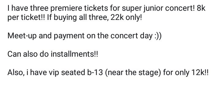 Hello! Meron pa siyang 3 premiere tickets and 1 vip seated na row B and malapit sa stage, pls dm