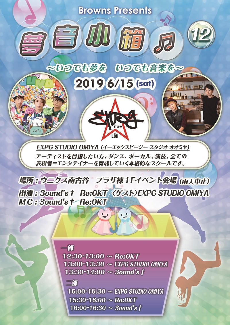 イベント出演「夢音小箱♫」中止のご案内 6月15日(土)にイベント出演を予定していた「夢音小箱♫」ですが、雨天予報のため中止となることが決定しました。 楽しみにしてくださっていた皆さん、大変申し訳ございません。 今後もステージパフォーマンスができるよう、日々練習に励みます!pic.twitter.com/eeiA4upGnr