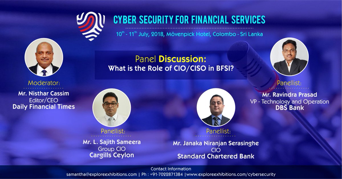 Panel Discussion - " What is the role of CIO / CISO in BFSI?" Cyber Security for Financial Services, 10th & 11th July 2018, Colombo, Sri Lanka . http://www.exploreexhibitions.com/cybersecurity
