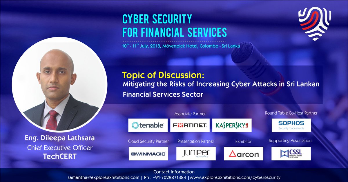 #TechCERT will be sharing insights on "Mitigating the#Risks of increasing#CyberAttacks in Sri Lankan#Financial Services Sector" at Cyber#Security for Financial Services conference. http://www.exploreexhibitions.com/cybersecurity pic.twitter.com/FfAz4tQreQ
