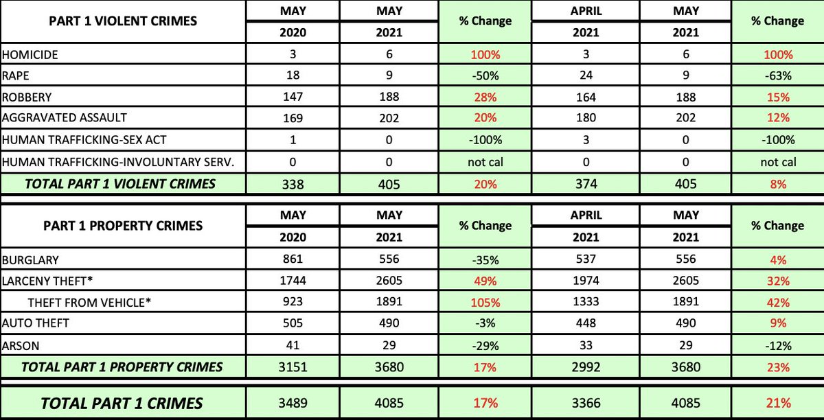 May 2021 @SFPD Compstat released. I don't think red data is a downward trend when comparing 5/20 v 5/21 and 4/21 v 5/21. I pulled a @HamasakiLaw and lopped off YTD data to avoid the 1/1/21-3/17/21 v 1/1/20-3/17/20 comparisons.pic.twitter.com/1esRctjIb0