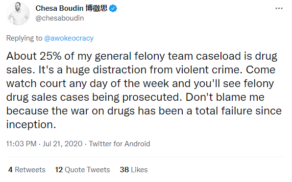 Re: overdoses. Boudin claimed that 25% of his load is “drug related and a distraction” “Give me kilos not crumbs.”