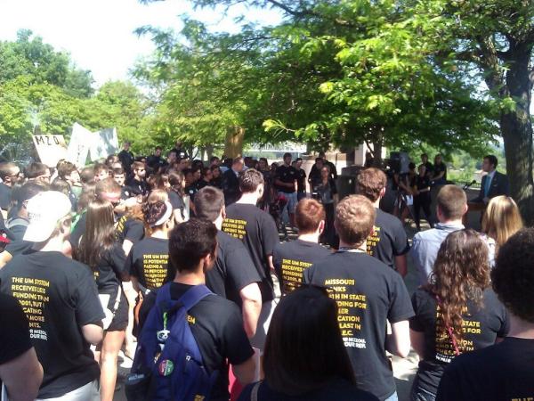 Interesting.cc @Nixon4Missouri MT @mucollegedems: MU Dems are proud to be at the @UM_ASUM #MoreForLess March w/ Mizzou!pic.twitter.com/BZNw7h2a