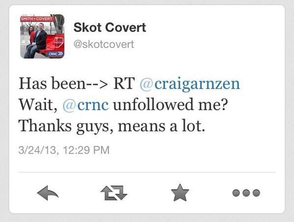 Wait, @crnc unfollowed me? Thanks guys, means a lot.