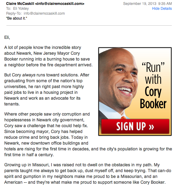 "@CoryBooker is a breath of fresh air," @ClaireCMc writes in fundraising memo to supporters. #NJSenpic.twitter.com/j27ji6zvUh