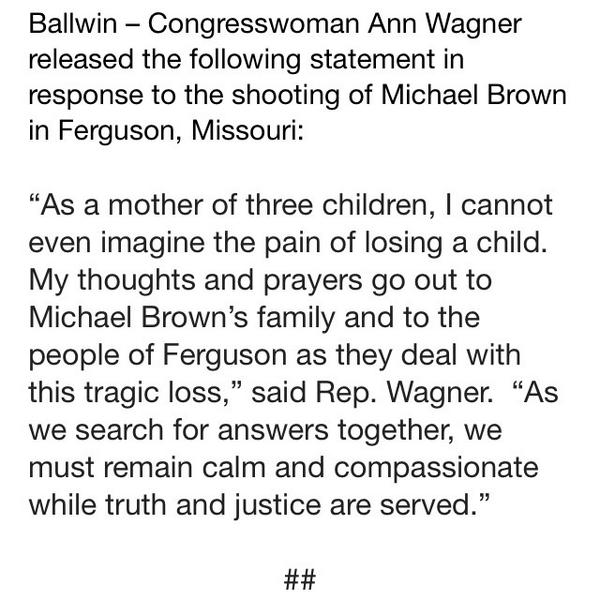 .@RepAnnWagner: "As we search for answers together, we must remain calm…while truth and justice are served” #Fergusonpic.twitter.com/O1NJIsId41