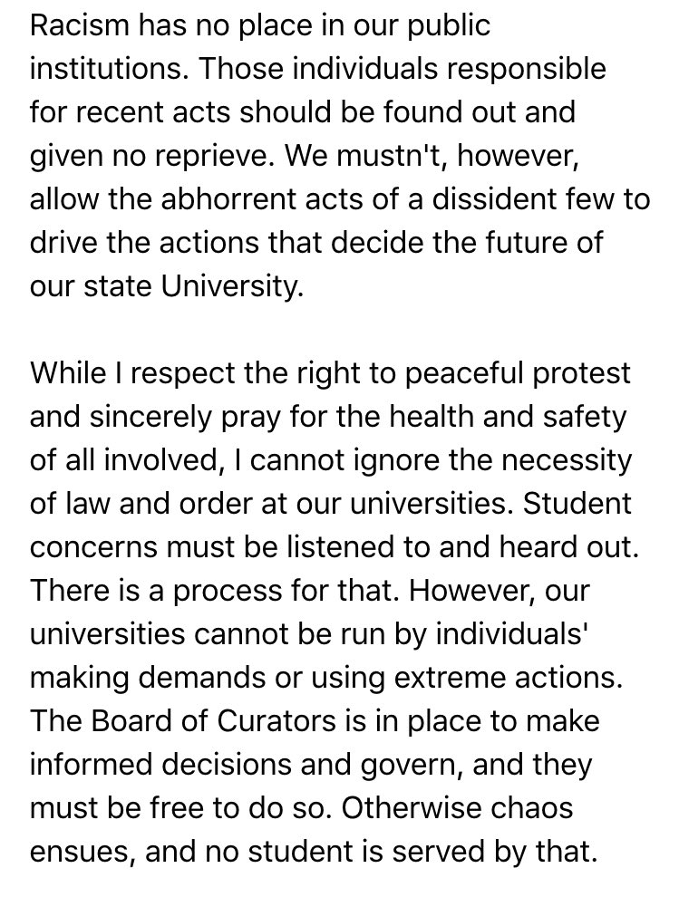 .@PeterKinder, on #ConcernedStudent1950, says school can't be run by "extreme actions" and demands. #MOGov #Mizzoupic.twitter.com/gXCHj8wZkJ