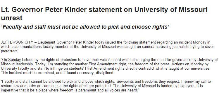 . @PeterKinder on situation at #Mizzou: "Faculty and staff must not be allowed to pick and choose rights"pic.twitter.com/Zb31NxNViM