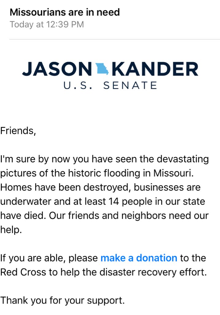 On the last day of the 4th Quarter, @JasonKander asked for a donation – to @RedCross for #moflooding victims. #MOSenpic.twitter.com/1Dsss1GB8u