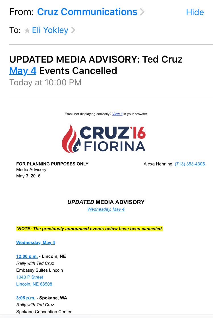 Ted Cruz has cancelled his campaign stops tomorrow.pic.twitter.com/U4KN1Po42C