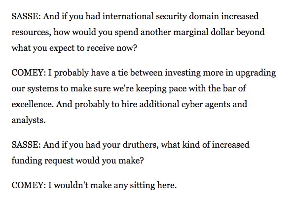 Whatever he told his DOJ superiors, James Comey also told @BenSasse he wanted more money at a hearing last week. https://www.washingtonpost.com/news/post-politics/wp/2017/05/03/read-the-full-testimony-of-fbi-director-james-comey-in-which-he-discusses-clinton-email-investigation/ …pic.twitter.com/BcShRW0wC8