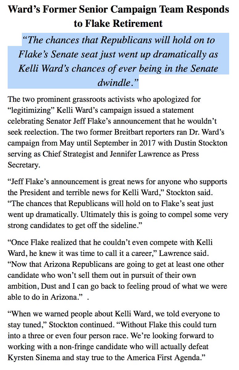 .@kelliwardaz's former chief strategist and press secretary just put out this brutal statement about their old boss re: Flake news. #AZSenpic.twitter.com/3mIGYbHkHJ