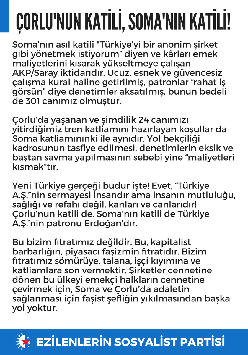 #Çorlu’nun katili de,#Soma’nın katili de Türkiye A.Ş.’nin patronu Erdoğan’dır. Partimizin#ÇorluTrenKazası'na dair açıklamasıdır