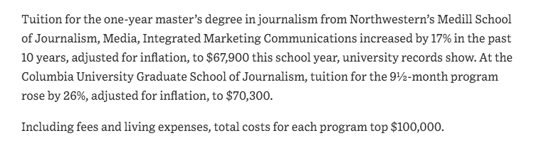 these are truly insane amounts of money to pay for a journalism degree https://www.wsj.com/articles/journalism-schools-leave-graduates-with-hefty-student-loans-11631275201 …pic.twitter.com/ZFndxWBCFL