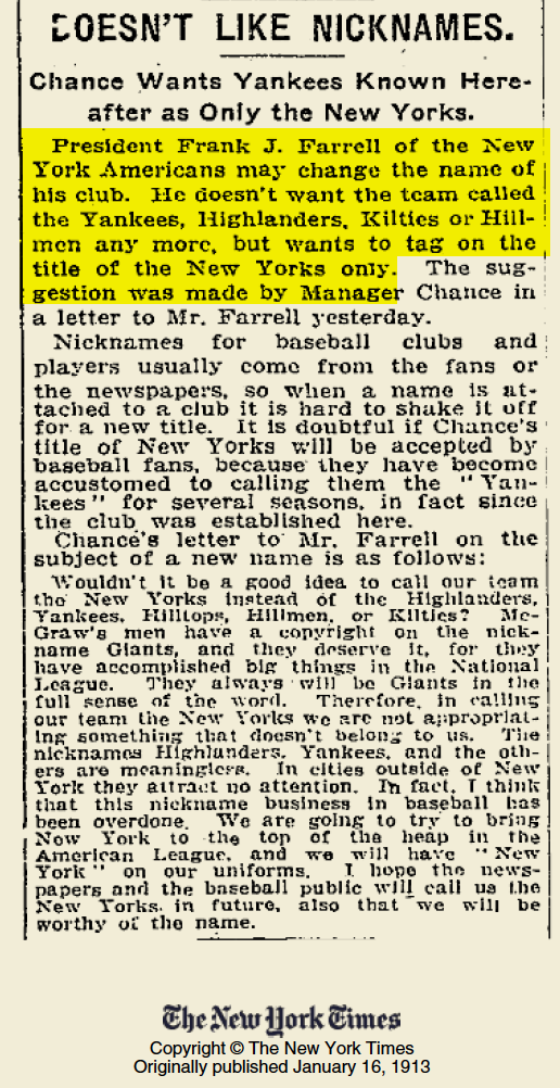 January 1913-Yankees co-owner Frank J. Farrell wants his team to be called "New Yorks" and not "Yankees"pic.twitter.com/UPVtQIThmY