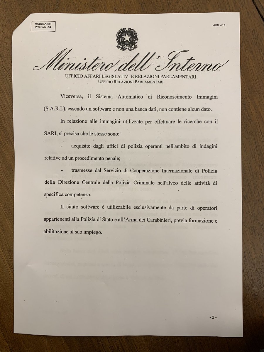 Questa la risposta del Viminale (era presente il sottosegretario Sibilia in Commissione Affari Costituzionali) in materia di riconoscimento facciale