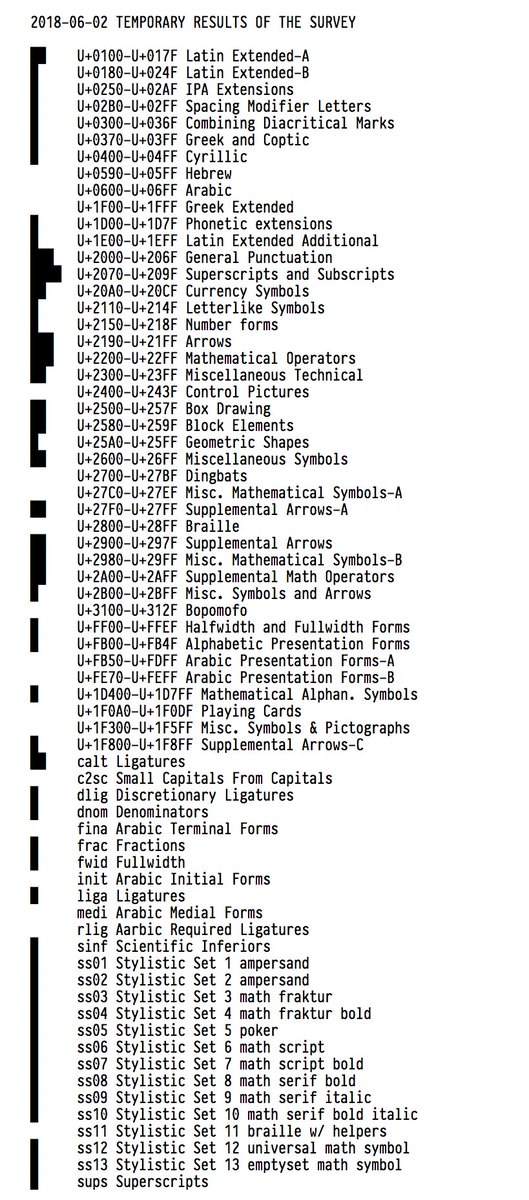 I decided to release a new Essential PragmataPro version in order to fix the slowdown of the complete #PragmataPro in #Terminal app Could you help me to find the very essential Unicode ranges and OpenType features, please? https://www.fsd.it/2018/06/01/essential-pragmatapro-survey/ … Thank you!!pic.twitter.com/0qjJfccAXX