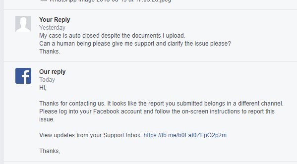 I assume I am in the same boat: Case #10160917581325387. I find ridiculous their auto response to the appeal / we got something wrong form after you upload IDs. It says that it's the wrong channel and you should... log in and follow the instructions. AS IF we could log in.pic.twitter.com/71nny9SU5D