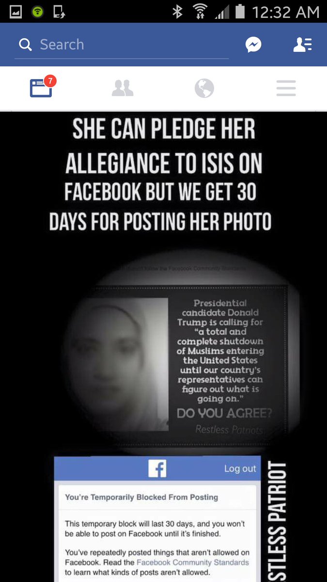 #SanBernadino terrorist can pledge allegiance to ISIS on @Facebook Patriot page suspended for posting her picture!pic.twitter.com/jMr5EqHayg