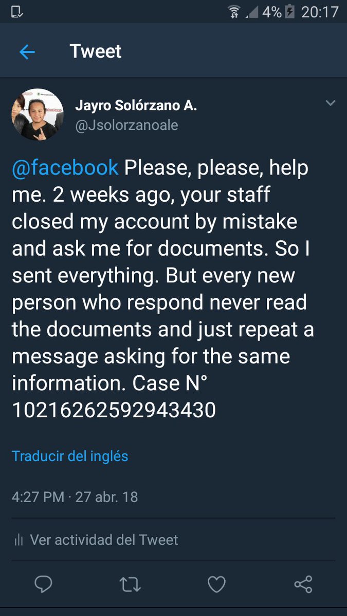 @facebook help me please... My account was closed by mistake one month ago and the staff didn't answer me since two weeks ago, when I sent the tweet in the image. I sent every document. Even the legal documents and I still don't have an answer. Please give me a cellphone or mail.pic.twitter.com/3JeuHmNjVk