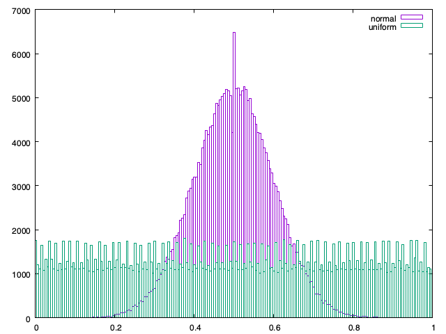 ゴミのような一様乱数(緑)でもボックス=ミュラー法にかけると何となく正規分布っぽい乱数(紫)が出来上がるという知見を得た。0.5付近にアホ毛が生えてるけどpic.twitter.com/RqM8VqTAbi