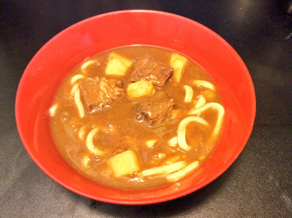 @4_mio_11 玉ねぎとジャガイモと肉を炒めます。 水と和風だしのもとを入れて煮ます。カレールーを入れます。別の鍋でうどんを茹でます。うどんを器に入れます。上からカレーをかけます。ネギがあったらのせます。