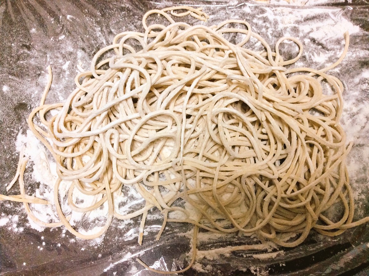 強力粉200ml 水45ml 粉末かんすい1g 塩2g をビニール袋に入れてまとまるまで捏ねて、15分放置して、ひたすら踏んで、パスタマシンで延ばしてカット。ゆで時間1分。ただこの手順で作った麺はふにゃふにゃになってどちらかというと失敗だった ._.