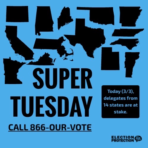 Super Tuesday is here! Call the @866OURVOTE Election Protection hotline (866-687-8683) if any issues arise at your polling place. #SuperTuesday #ProtectTheVotepic.twitter.com/FyXAaB5zUp